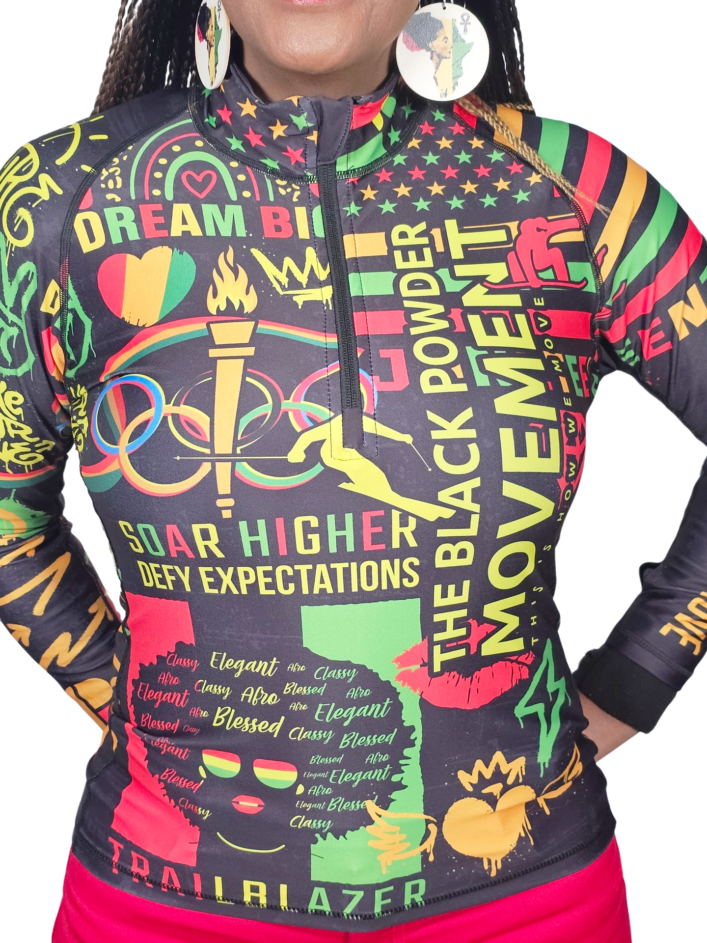 The "Trailblazer" women's shirt is a vibrant celebration of empowerment and cultural pride, featuring the Olympic torch and rings to symbolize excellence and unity. Its central graphic showcases a black woman with an Afro, representing natural beauty and cultural identity. Intricately woven into her hair are words like "blessed" and "elegant," highlighting her inner qualities. The design is anchored by the word "Trailblazer" below her image, boldly declaring the wearer's pioneering spirit and individuality.