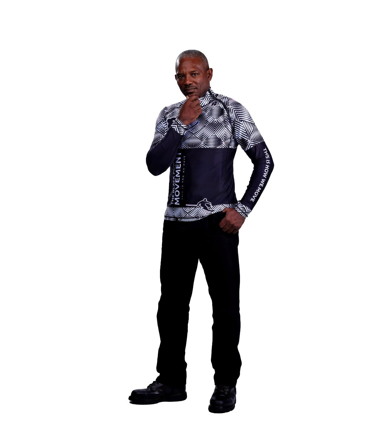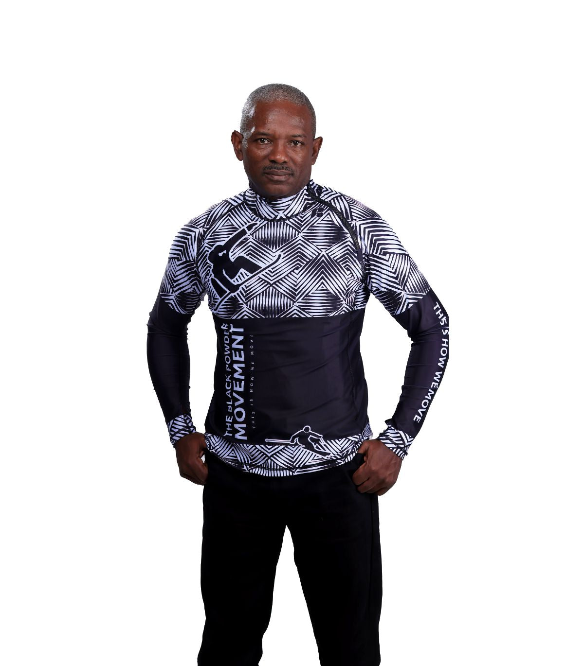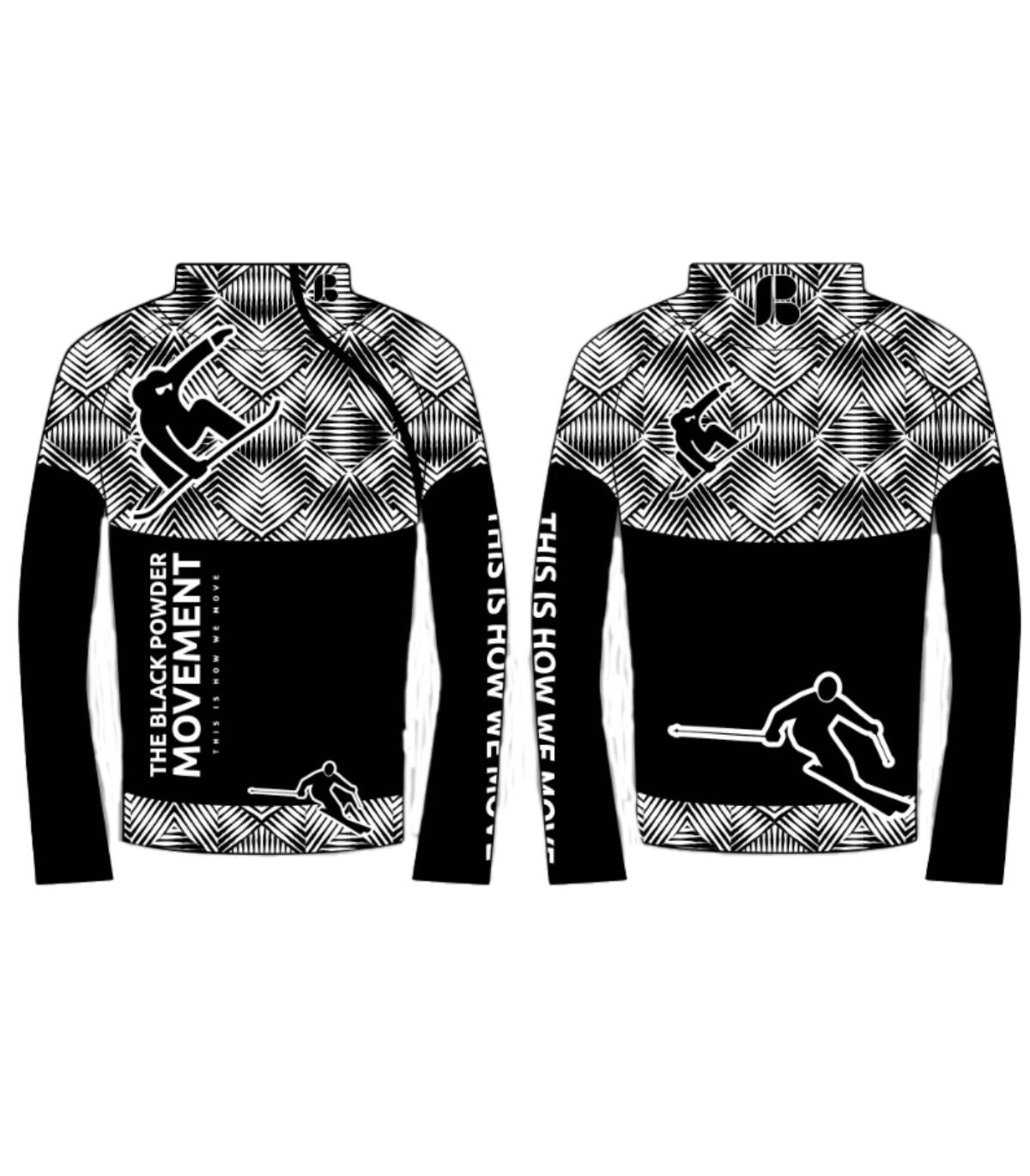 This striking black and white shirt, featuring a bold geometric design and iconic skier and boarder symbols, embodies the spirit of The Black Powder Movement. With its asymmetrical zipper, thumb holes, and UV protection, it's as functional as it is stylish. The solid black accents on the sleeves, front, and back create a dynamic look that will turn heads on the mountain and in the lodge.