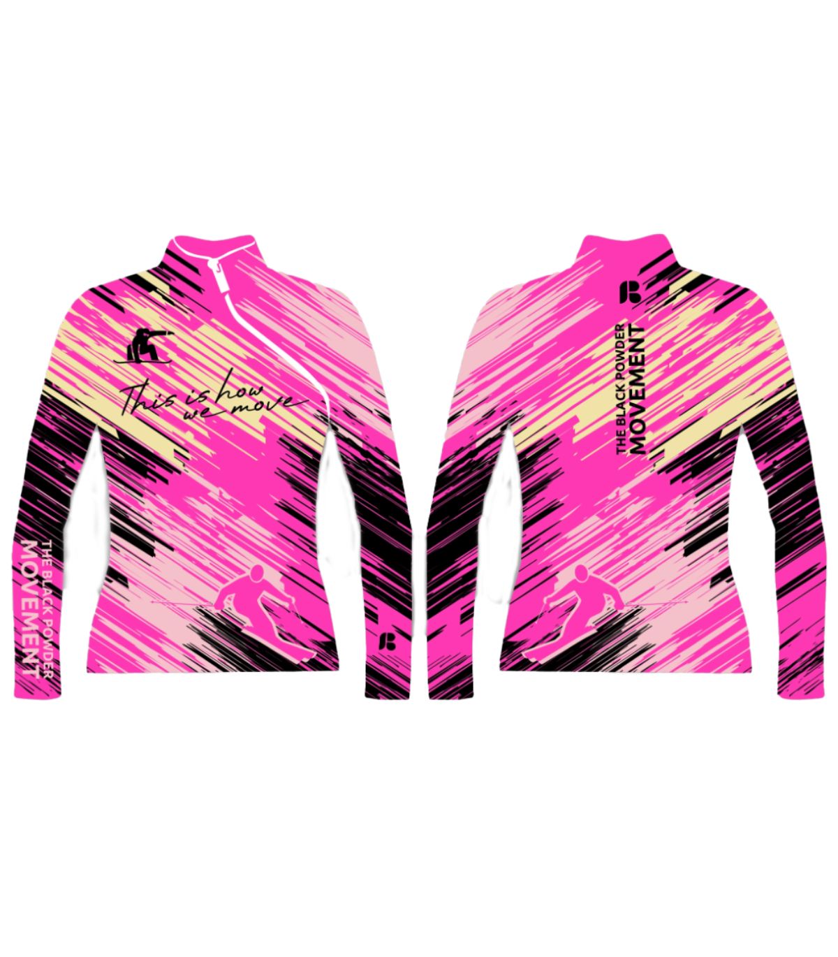 Embrace the energy and passion of winter sports with the 'Pink Passion' shirt. Bold diagonal lines in pink, black, white, and tan create a dynamic visual, while the "This is how we move" slogan on the sleeve encapsulates the spirit of The Black Powder Movement. Iconic skier and boarder symbols complete the design, celebrating your love for the mountain. With its asymmetrical zipper, thumb holes, and UV protection, this shirt isn't just about looks - it's about expressing your passion, staying comfortable, and making a statement on and off the slopes.