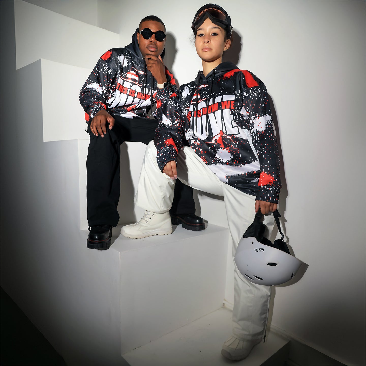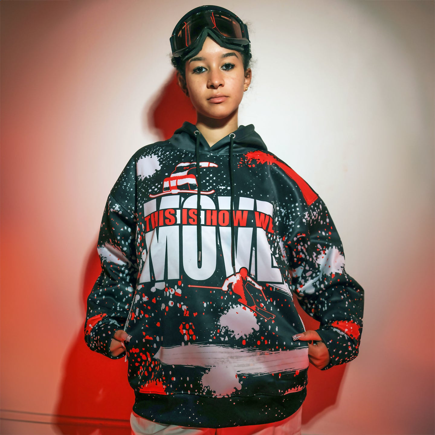 Designed for those who never slow down, the Velocity Hoodie captures speed and strength in every detail. With dynamic splatter graphics and bold typography, it’s perfect for layering on the slopes or making an impact in the city.